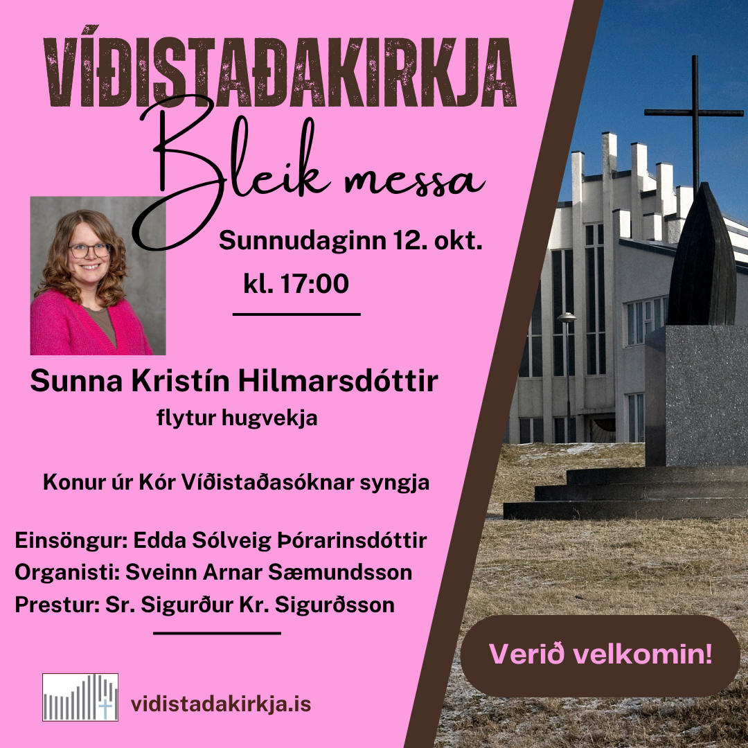 Bleik messa sunnudaginn 12. okt. kl. 17:00. Sunna Kristín Hilmarsdóttir flytur hugvekju. Konur úr Kór Víðistaðasóknar syngja og Edda Sólveig Þórarinsdóttir syngur einsöng undir stjórn Sveins Arnars Sæmundssonar organista. Sr. Sigurður Kr. Sigurðsson þjónar fyrir altari.