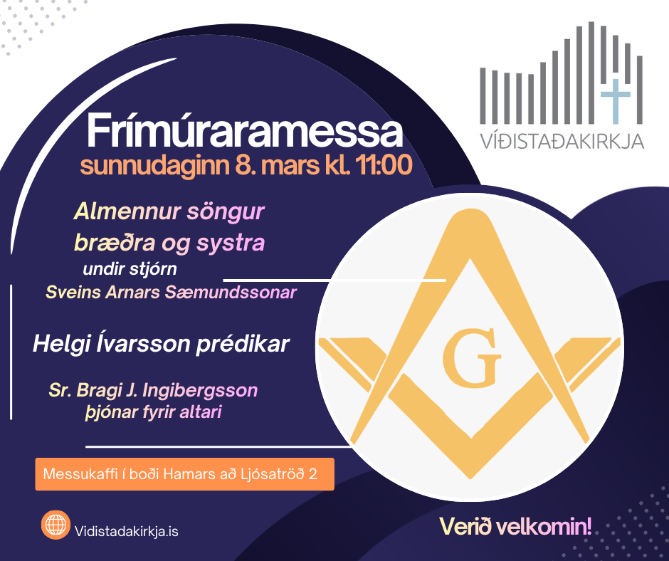 Guðasþjónusta kl. 11:00 sunnudaginn 8. mars. Kirkjuferð Frímúrarastúkunnar Hamars í Hafnarfirði. Helgi Ívarsson prédikar og sr. Bragi J. Ingibergsson sóknarprestur þjónar ásamt fleiri Hamarsbræðrum. Almennur söngur bræðra og systra við undirleik Sveins Arnars Sæmundssonar organista.